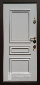 Входная дверь для квартиры, где важны тишина и порядок. Снаружи — прочная порошковая шагрень глубокого коричневого цвета: фактура скрывает следы касаний, спокойно переносит влажную уборку и не выгорает в подъезде. Внутри — светлая МДФ-панель с большим зеркалом во весь рост: визуально расширяет узкий коридор, помогает собраться перед выходом и легко моется. Ровная посадка полотна, двойной контур уплотнения и массивные ригели создают плотное, «глухое» закрывание; на петлевой стороне — противосъёмные штыри, добавляющие спокойствия каждый день. Фурнитура собрана аккуратно: глазок на удобной высоте, утопленные накладки, плавный ход ручки. Сдержанный внешний вид и практичный интерьер — удачная, долговечная комбинация для повседневной эксплуатации.