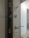 В подъездной эксплуатации эта модель чувствует себя уверенно: снаружи прочное молотковое напыление не боится ключей, сумок и частых прикосновений, фактура скрывает мелкие следы и долго держит цвет. Внутри — МДФ под ПВХ в светлом тоне и зеркало почти во весь рост: прихожая кажется шире, сбор образа перед выходом занимает секунды, а пленка допускает влажную уборку без капризов. У входной двери в квартиру с порошком и МДФ с зеркалом фурнитура разнесена по уровням: верхний замок дополняет нижний цилиндровый, изнутри — удобный вертушок, глазок дает чистый обзор площадки. Черная притворная линия и строгая фрезеровка панели собирают композицию: лаконично, современно и по-городски практично.